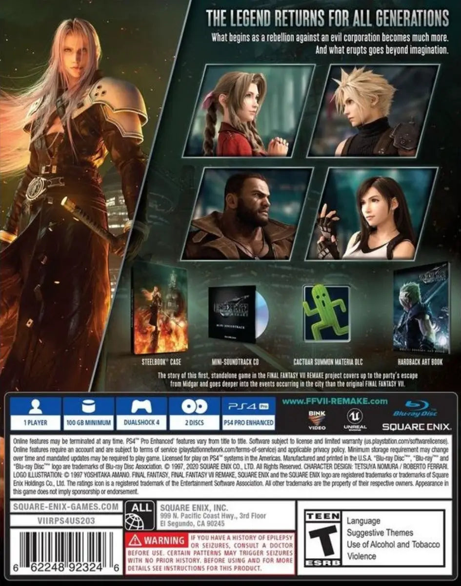 - Deluxe Edition Includes - FINAL FANTASY VII REMAKE game, Artbook, Mini Soundtrack, Steelbook, Cactuar Summon Materia DLC*
