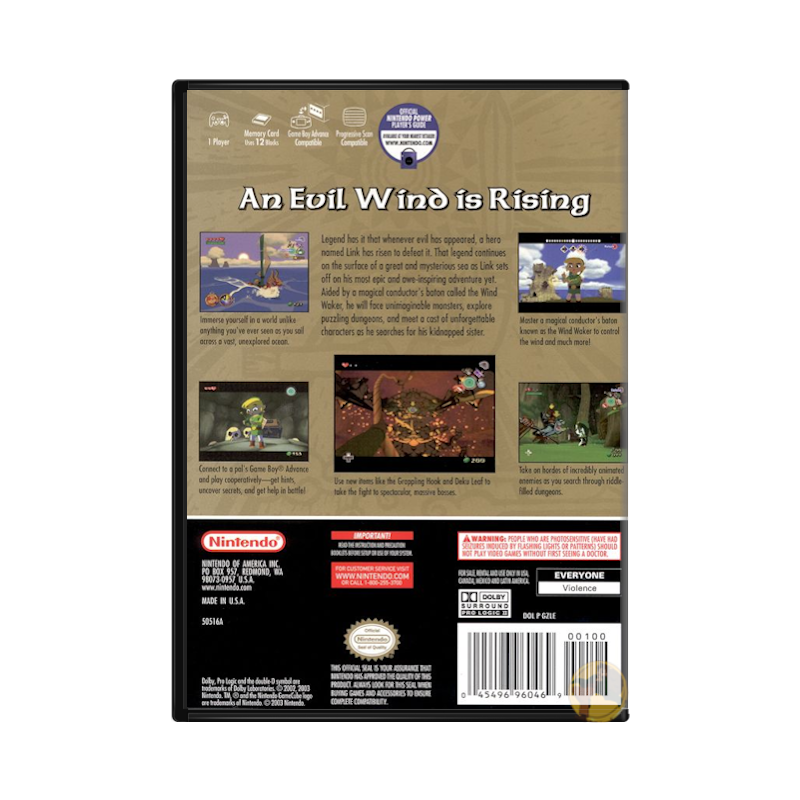 Legend has it that whenever evil has appeared, a hero named Link has risen to defeat it. That legend continues on the surface of a great and mysterious sea as Link sets off on his most epic and awe-inspiring adventure yet. Aided by a magical conductor's baton called the Wind Waker, he will face unimaginable monsters, explore puzzling dungeons, and meet a cast of unforgettable characters as he searches for his kidnapped sister.