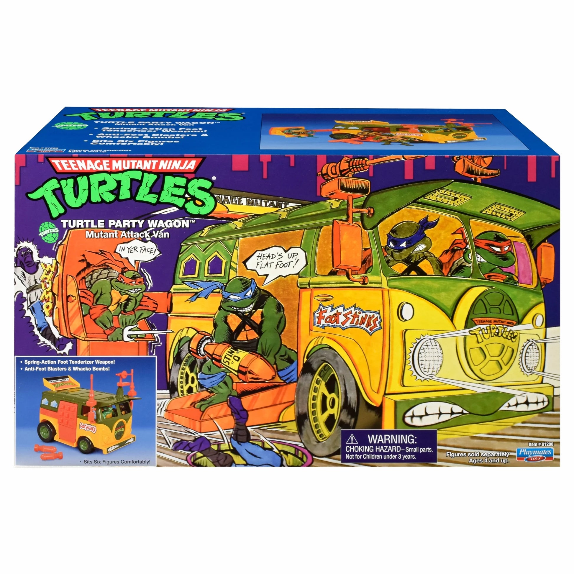 From Playmates. Roll up to the Foot Dojo to kick some shell with the Classic Original Party Wagon Action Figure Vehicle from Playmates! Heavily armored and outfitted with every advanced weapon Donatello could invent, this mobile fortress is an unstoppable force! The Spring-Action Foot Tenderizer on the side is perfect for dislodging any clingy Foot Soldiers while the flip-top gives you easy access to the pair of Whacko Bombs inside. Perfect for pairing with the rest of your TMNT collection, you'll have Shredder running for cover with this heavy-duty destroyer on the roads. Action figures pictured are sold separately.