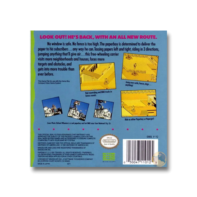 Rise and shine, bud! A great day's ahead, just waiting for you to become the neighborhood's terror of a paperboy. but it's a whole new job with double the fun and twice the excitement! That's right, you've now got houses on both sides of the street - which means even more customers' homes to deliver papers to and non subscribers' homes to damage. It also means you've got to watch out for lots more obstacles and meanies that are out to knock you off your bike! Wreak mischief across the town or do good deeds like saving the baby and stopping the burglar. At the end of the day, hone your skills on the all-new BMX-style test course. Add the new awesome graphics, and you're in for a rip roaring time on your bike!