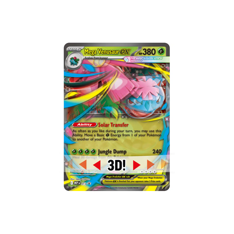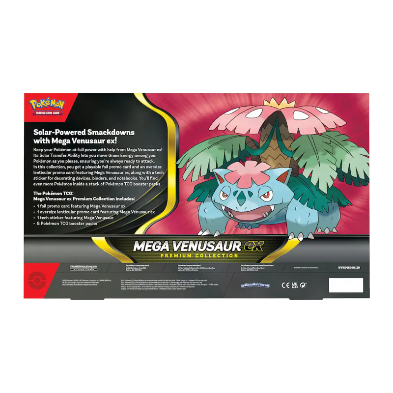 Its Solar Transfer Ability lets you move Grass Energy among your Pokémon as you please, ensuring you’re always ready to attack. In this collection, you get a playable foil promo card and an oversize lenticular promo card featuring Mega Venusaur ex, along with a tech sticker for decorating devices, binders, and notebooks. You’ll find even more Pokémon inside a stack of Pokémon TCG booster packs.